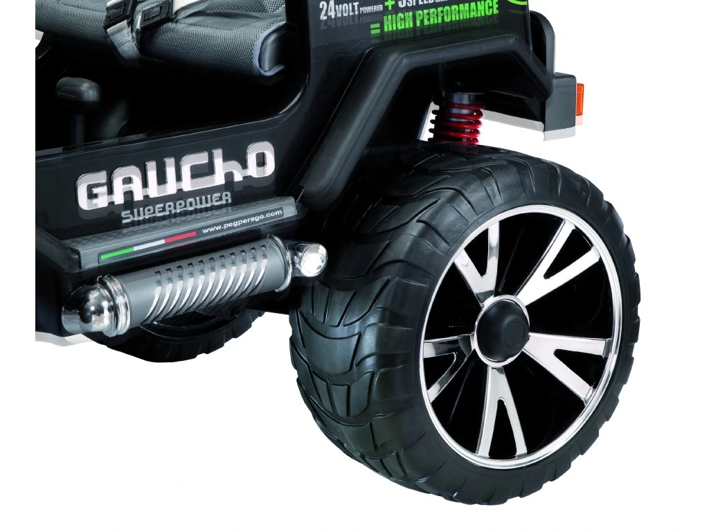 Náhradní pravé kolo na elektrické autíčko Gaucho Superpower. Kolo má gumový běhoun, který razantně zvyšuje trakci, aby autíčko mohlo jezdit po všech druzích terénu, a také snižuje hluk na pevných površích.