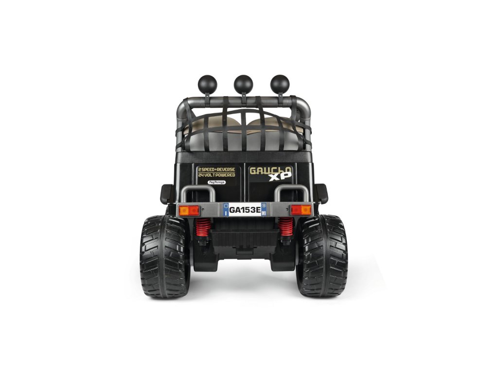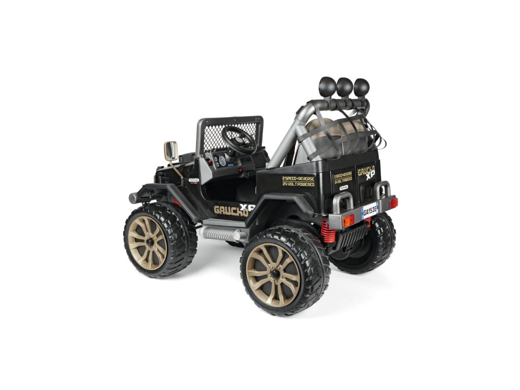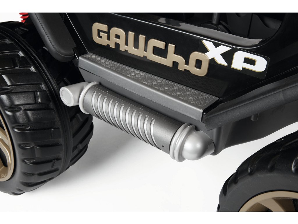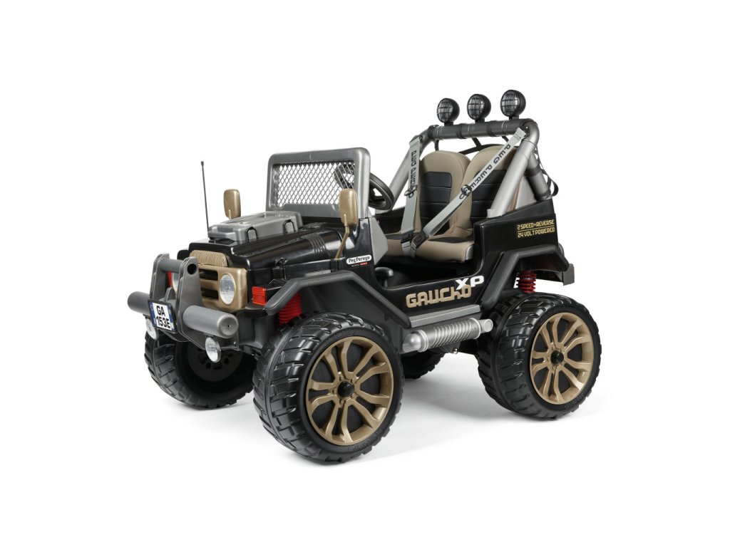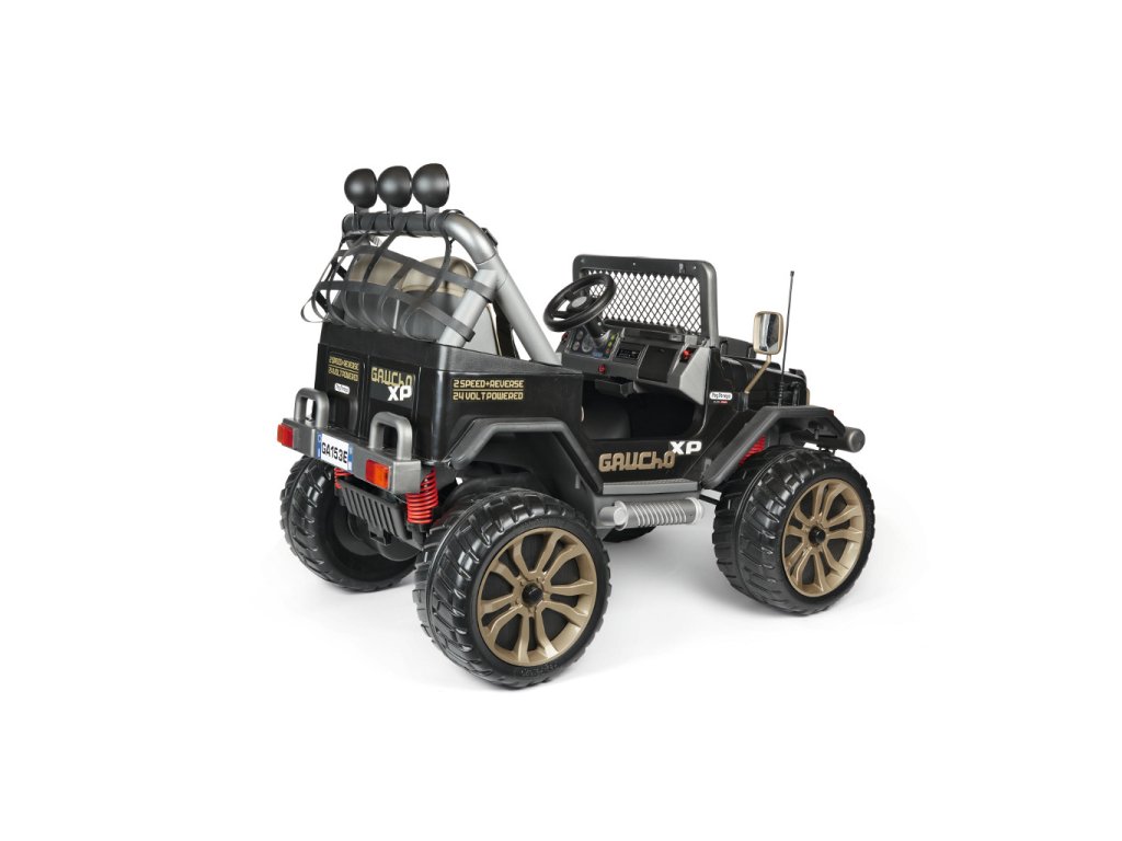 Dětské elektrické autíčko Gaucho XP od výrobce Peg Perego je dětský džíp se dvěma nastavitelnými sedadly, takže si vaše dítě může na dobrodružnou cestu vzít i svého kamaráda. Během jízdy na čtyřech plastových kolech, která jsou připravena i na terénní štěrkové podmínky, si děti mohou pustit hudbu ze zabudovaného FM rádia s MP3 vstupem a užít si dokonalou jízdu rychlostí až 8 km/h! Toto dětské elektrické autíčko se ovládá pomocí jednoho pedálu – plynu i brzdy zároveň. Jeden ze dvou rychlostních stupňů nebo zpátečka se nastavují.